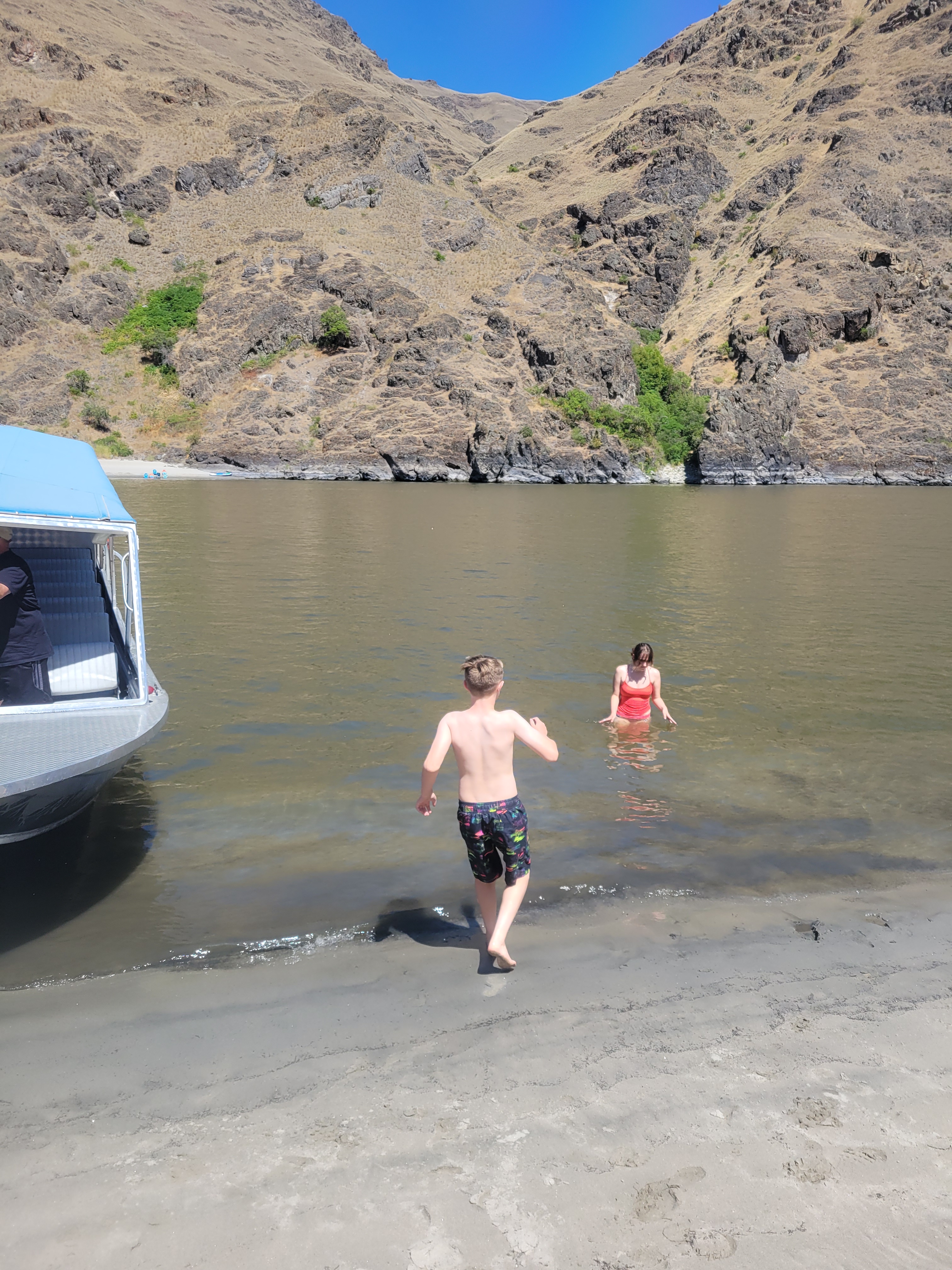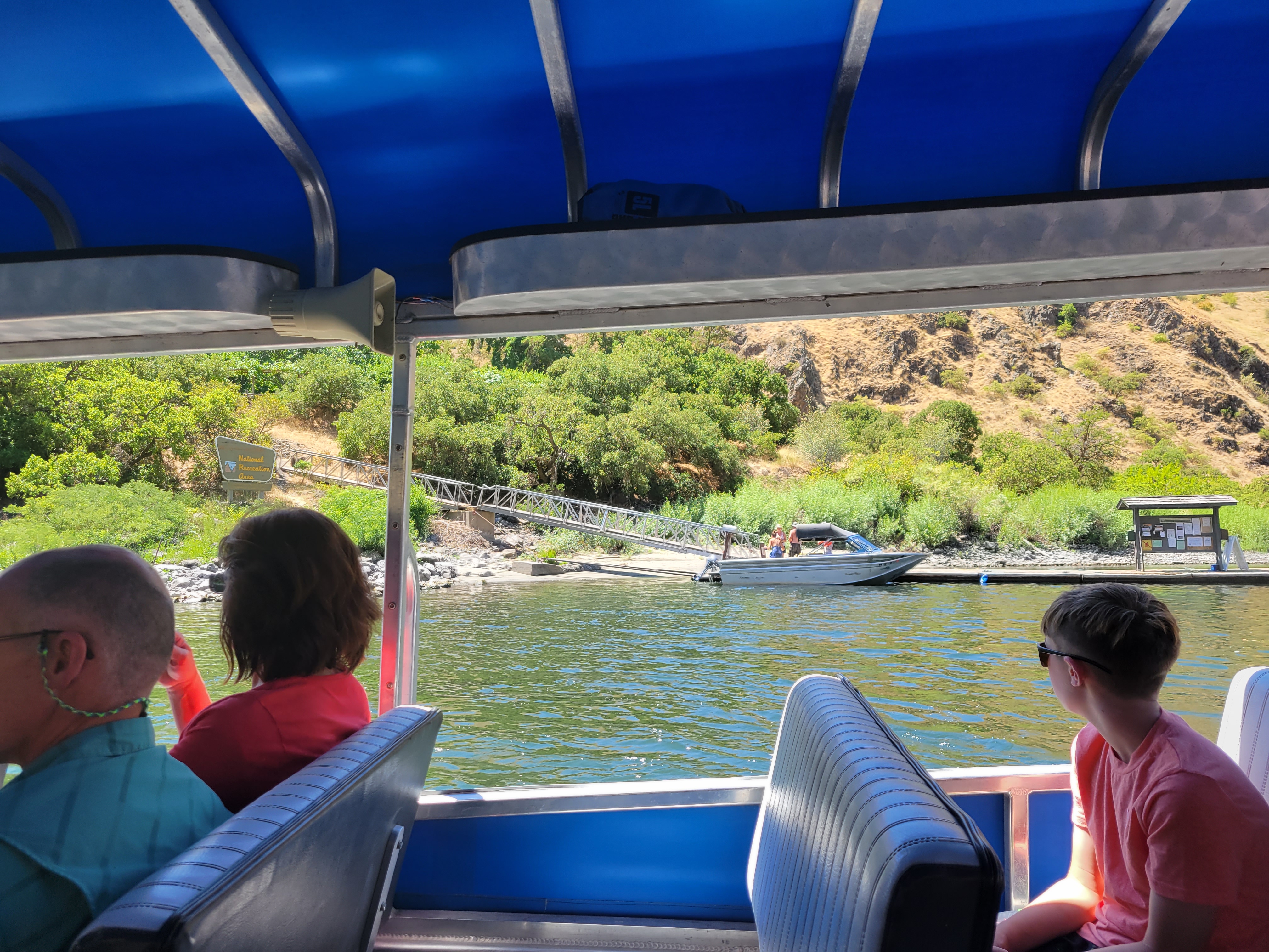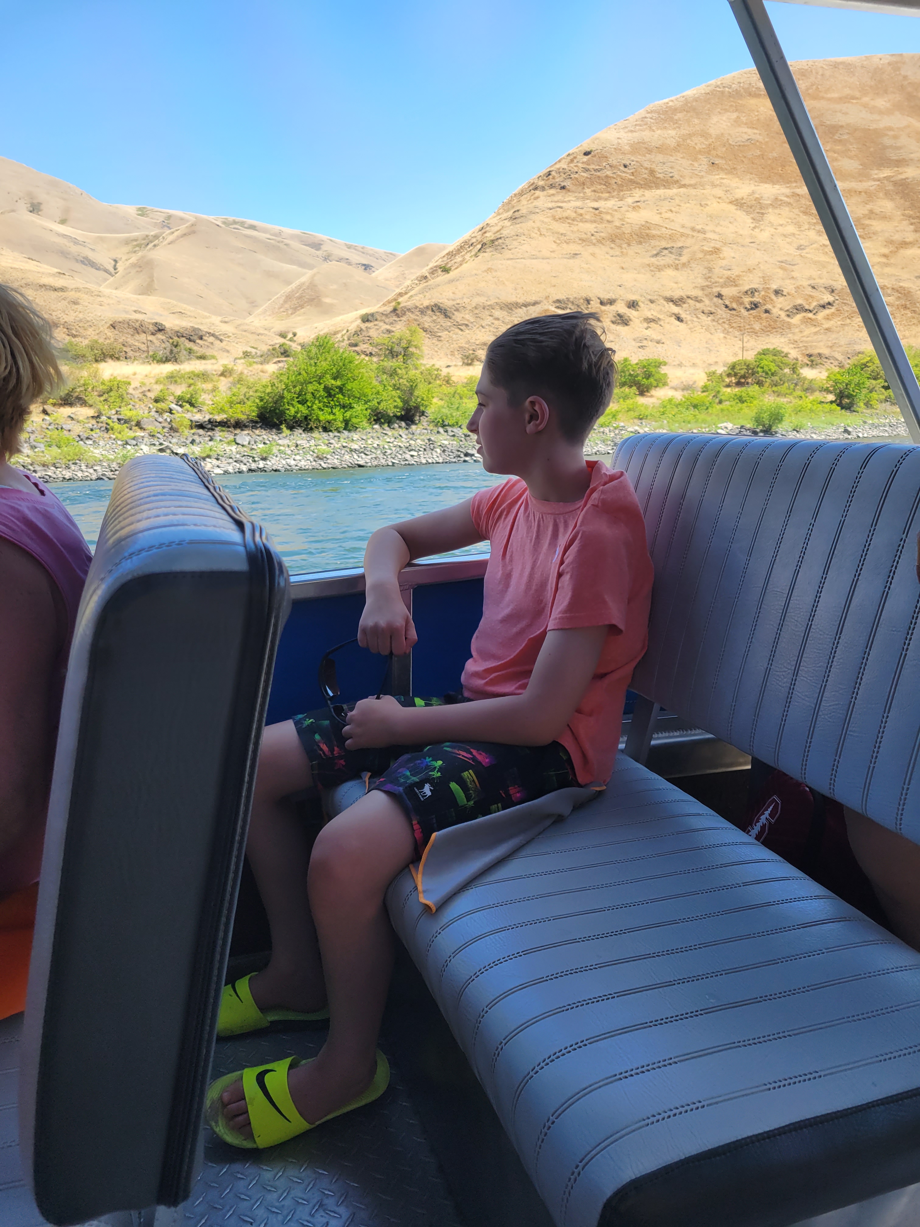 In truth, we stayed in Clarkston, Washington, across from Lewiston, Idaho. (Everything’s named after these guys out here.) This was one of the places we decided to let Chris have time to work. There was a nice, air conditioned, and empty work room at our campsite. Although our trailer is air conditioned, it can’t quite get the RV cooler than 85 degrees in excessive heat with no tree cover. Lucky for the kids, they were already over their mild versions of Chris’ cold so they were up for any activity I felt we could safely do (in Covid-era). The choice was fairly easy. At the docks a few yards from our site, there was a jet boat company who did tours of Hells Canyon with lunch included.