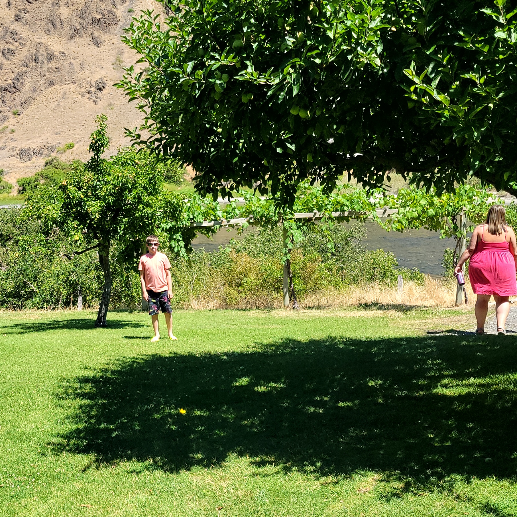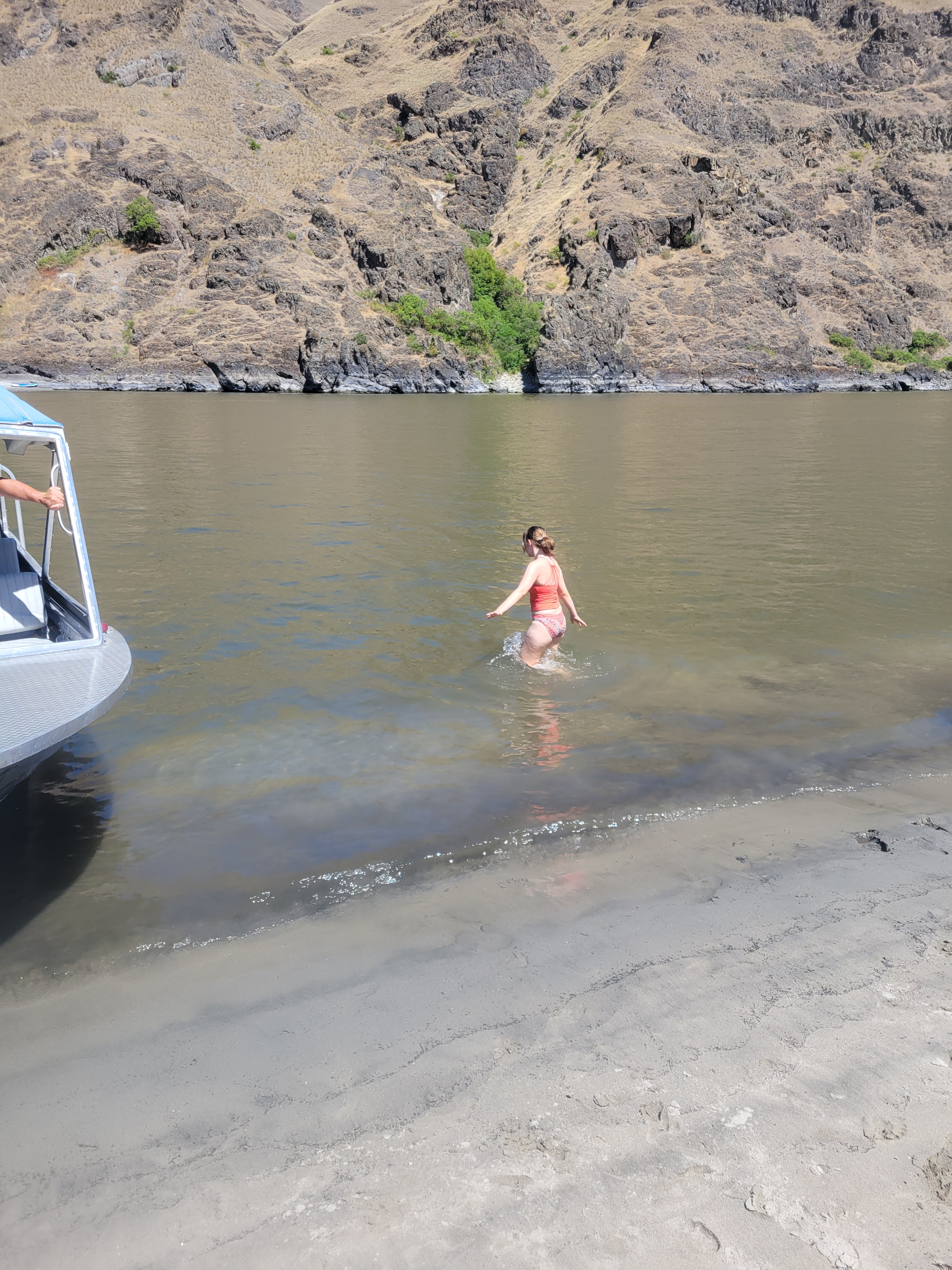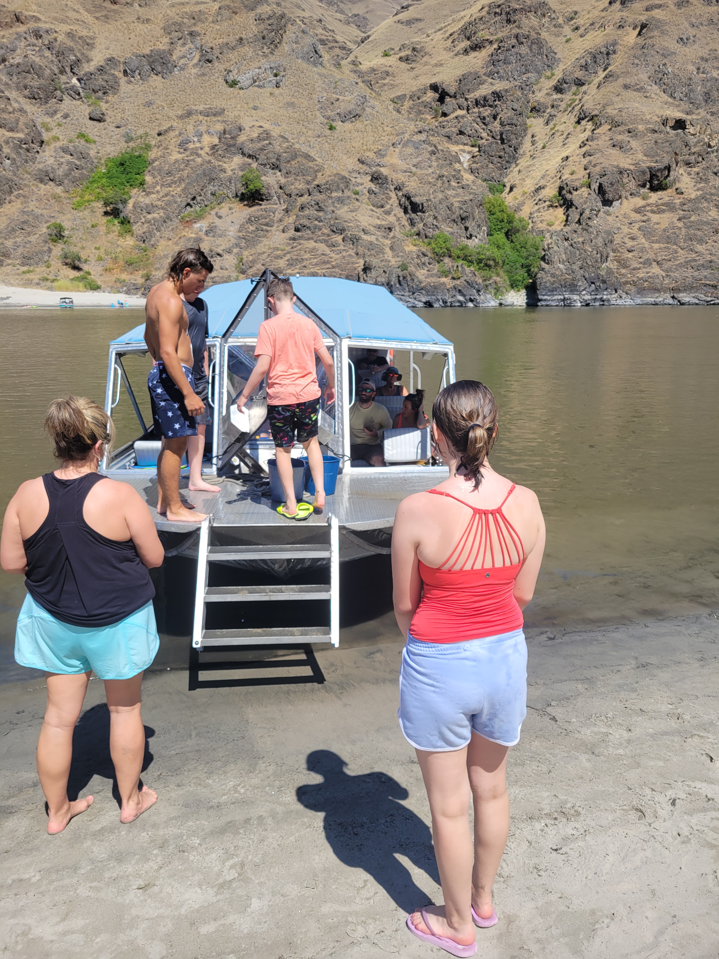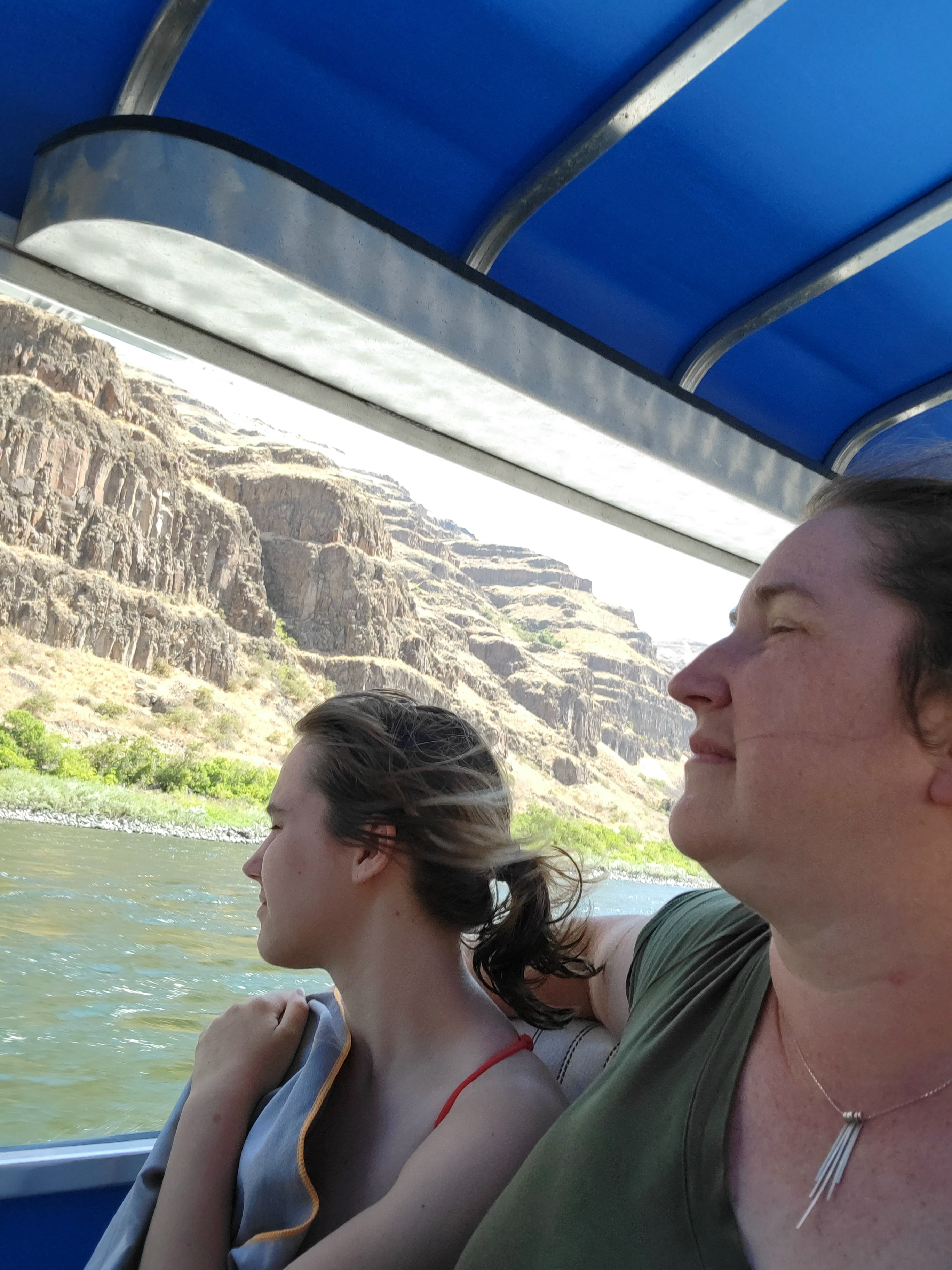 In truth, we stayed in Clarkston, Washington, across from Lewiston, Idaho. (Everything’s named after these guys out here.) This was one of the places we decided to let Chris have time to work. There was a nice, air conditioned, and empty work room at our campsite. Although our trailer is air conditioned, it can’t quite get the RV cooler than 85 degrees in excessive heat with no tree cover. Lucky for the kids, they were already over their mild versions of Chris’ cold so they were up for any activity I felt we could safely do (in Covid-era). The choice was fairly easy. At the docks a few yards from our site, there was a jet boat company who did tours of Hells Canyon with lunch included.