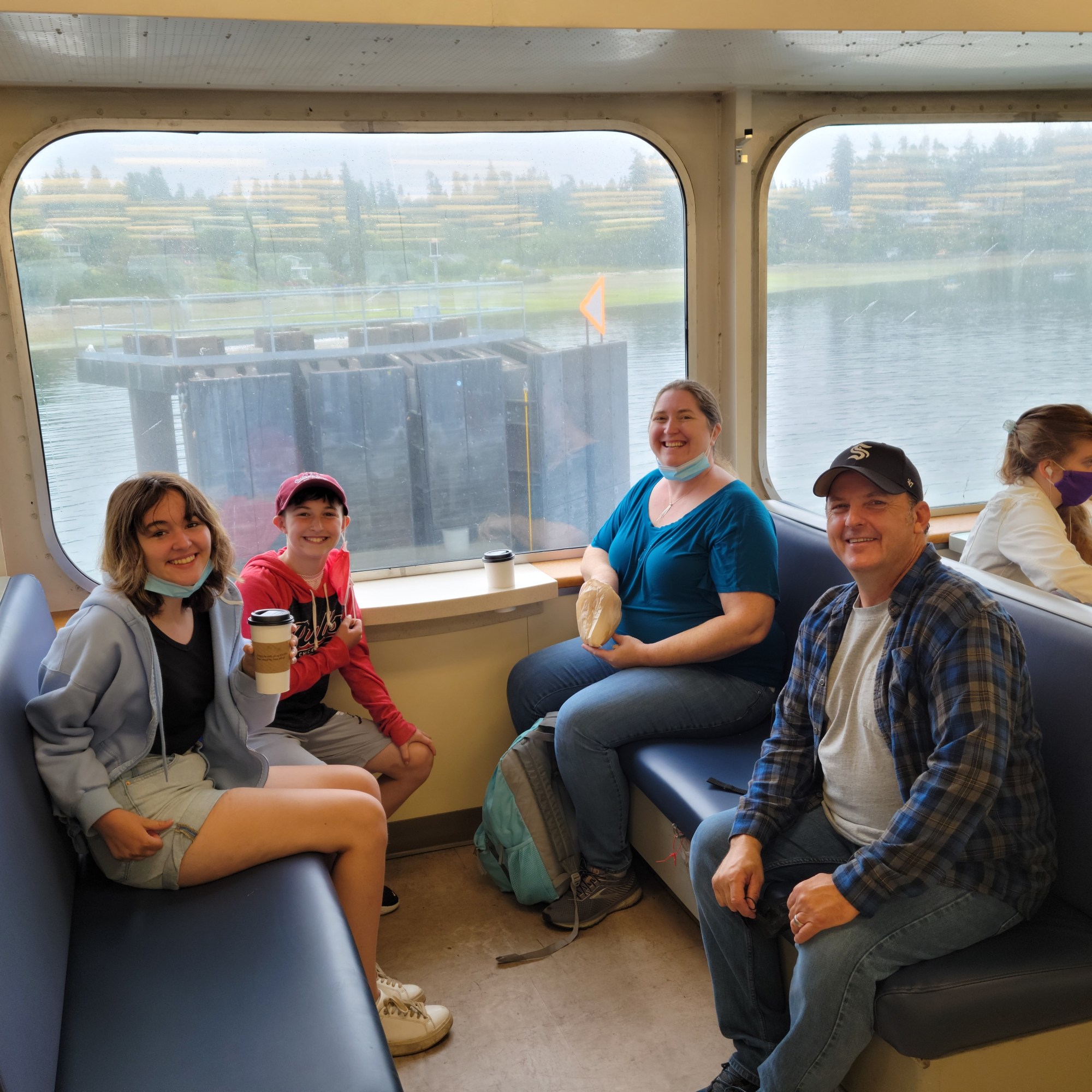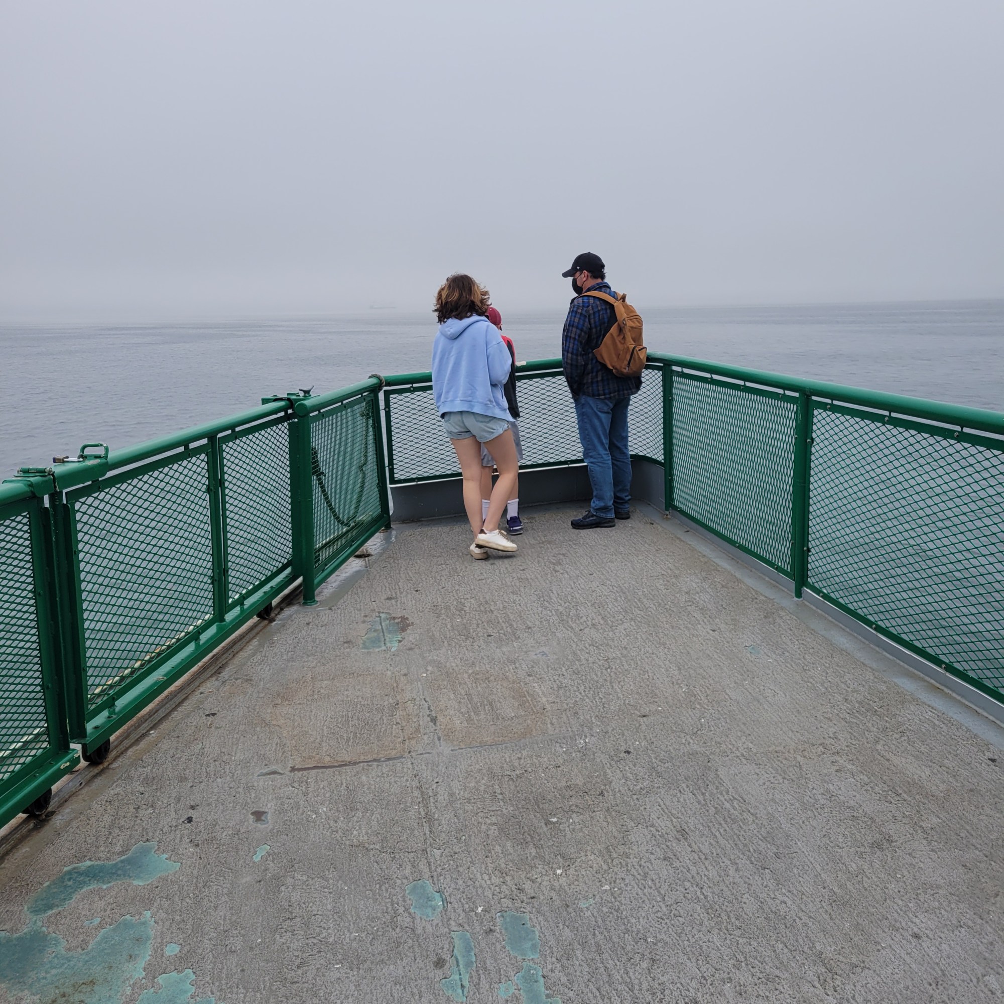 When I woke the next day, I didn’t feel any better, but we had plans to meet up again with a cousin who we’d seen the day before and who lives on Bainbridge Island and works in the city. He took us on a very personal and fun tour of Seattle. Here we are on the ferry and arriving during the foggy hours of the morning.