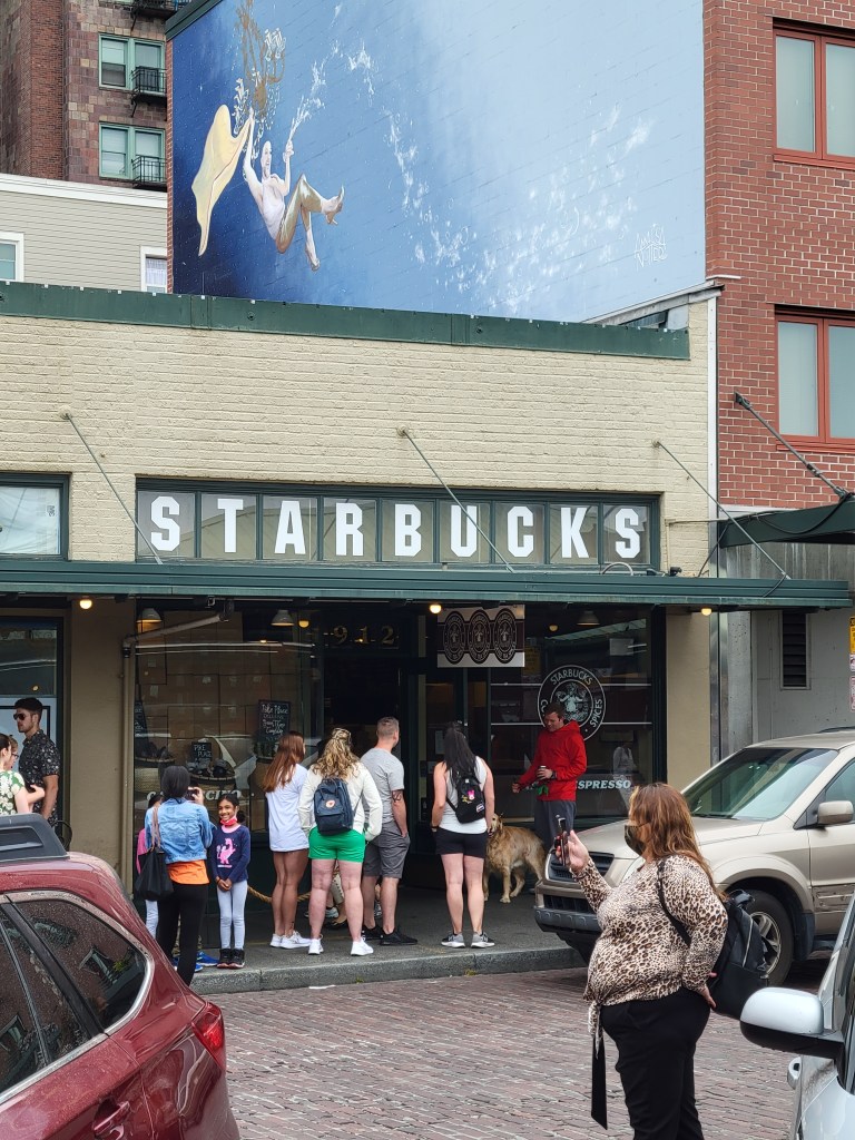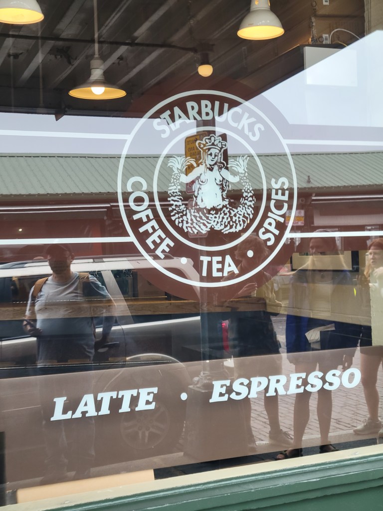 After that, we dropped by the first Starbucks (but didn’t feel like standing in line). I had read once that they changed the logo because *looks around and whispers* boobs. So of course I had to take ten million pictures of the original logo and buy two cups (from the less crowded Starbucks up the block) that featured it as well.