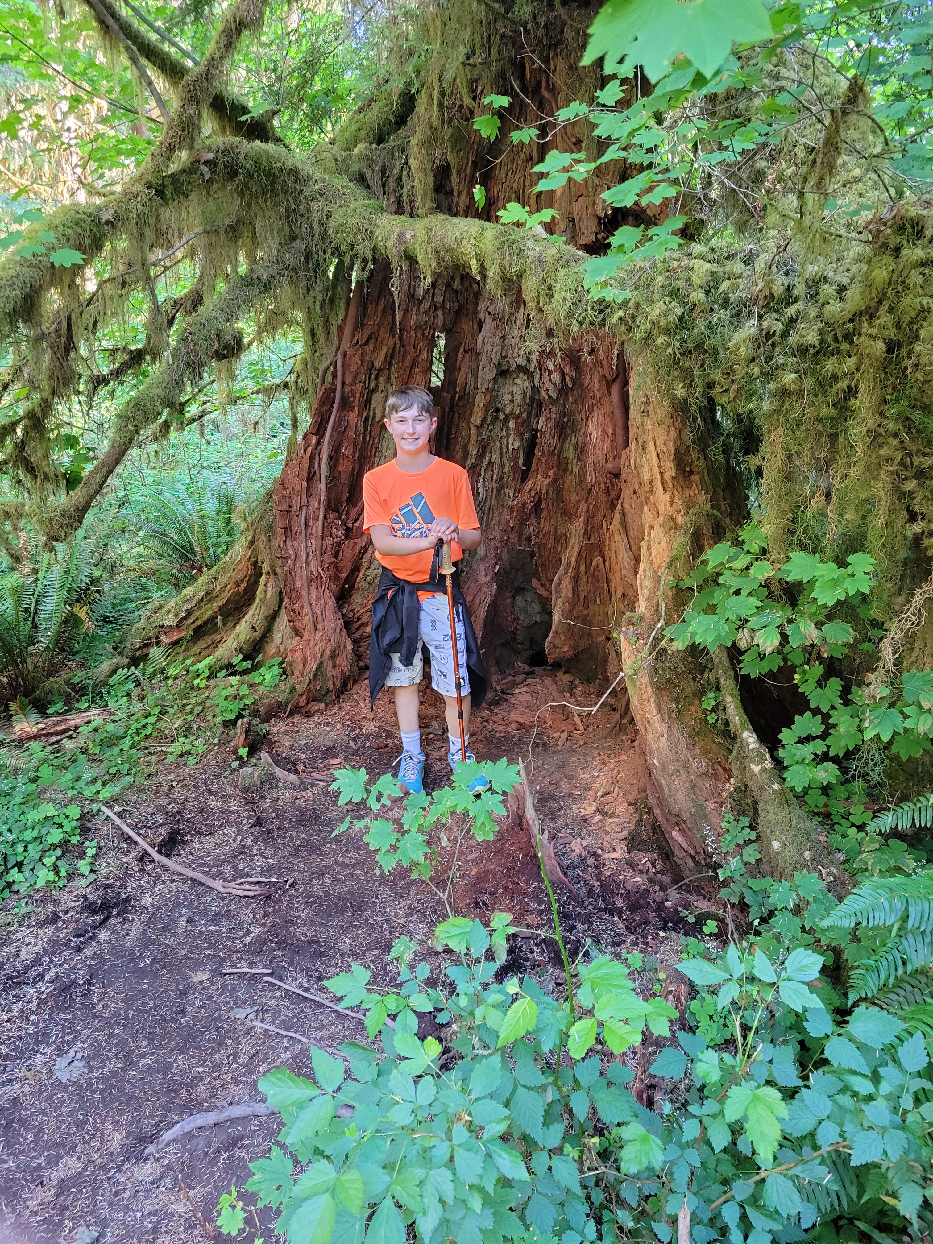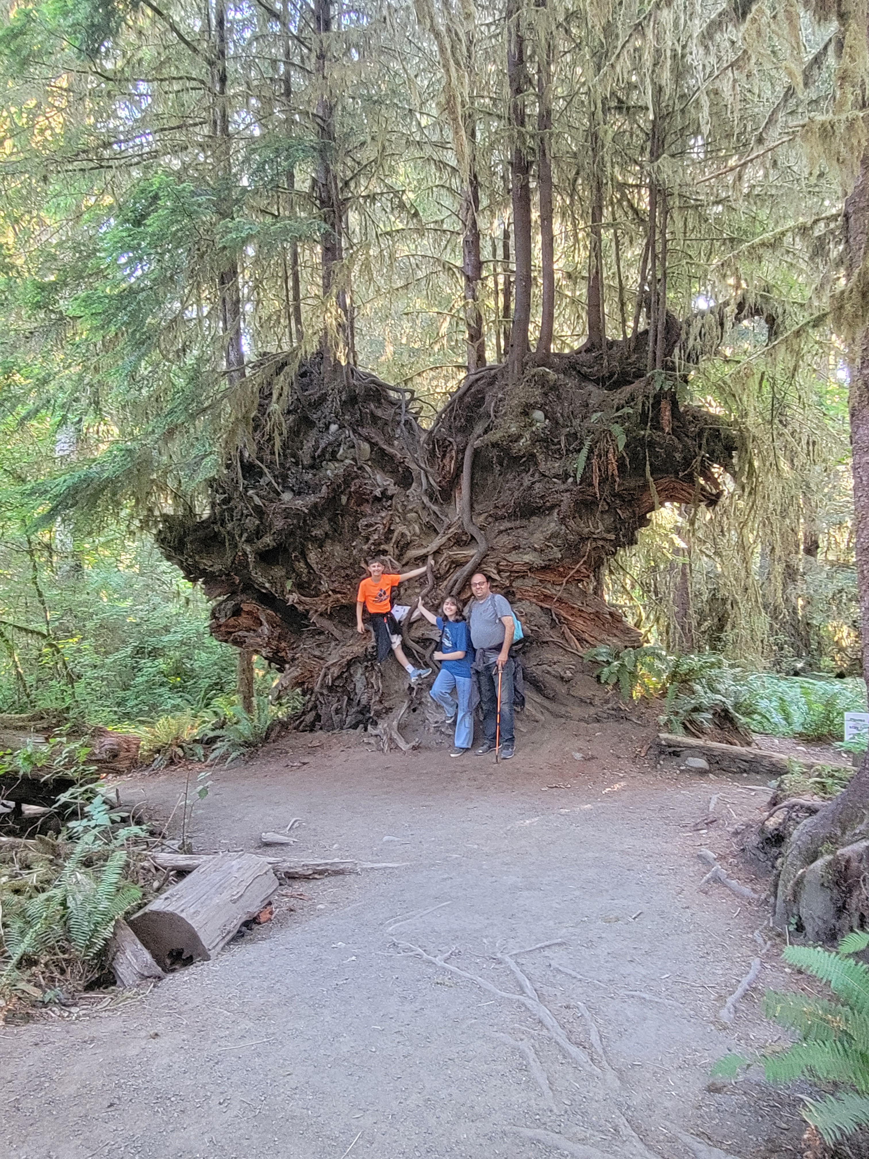 When we reached the visitor’s center, we found packed parking lots. However, turnover for spots was high in the late afternoon, and we found one right near the trailheads easily. As a family, we took the Spruce Nature Trail, which had a variety of sights: old growth and new growth trees, Hoh River views, and bridges over streams. We did not run into the bad-tempered elk that we were warned against at the trailhead, but we did find a banana slug, which was a little gross. It was a shame that we arrived after a long dry spell because a lot of undergrowth and mosses were brown and wilted. That didn’t diminish how verdant the whole forest was, with moss hanging from branches, green plants carpeting the ground, and leaves sprouting from every level of the canopy. At the end of the trail, I took Izzy to rest in the truck while Chris and Matthew hiked the Hall of Mosses Trail.
