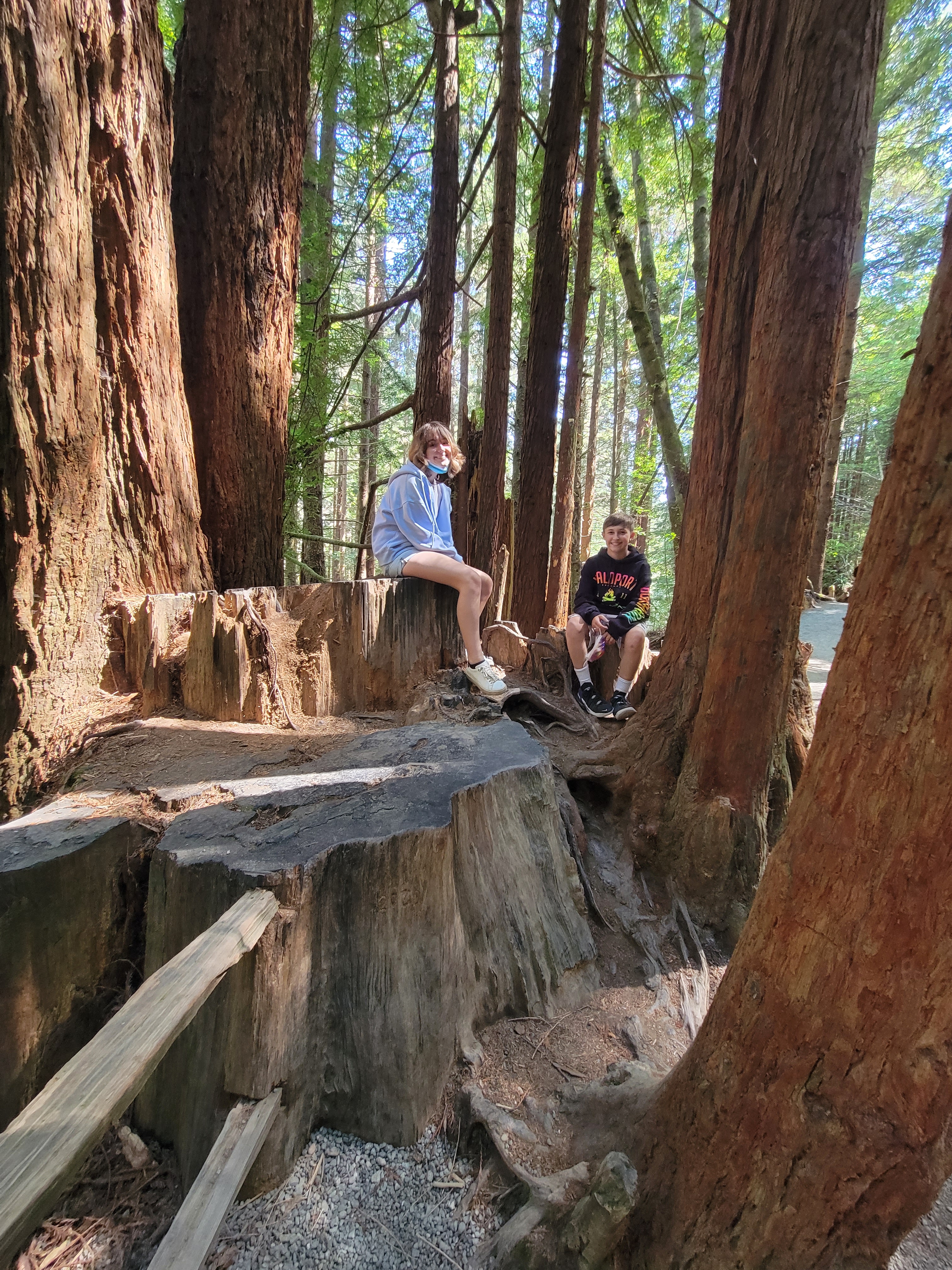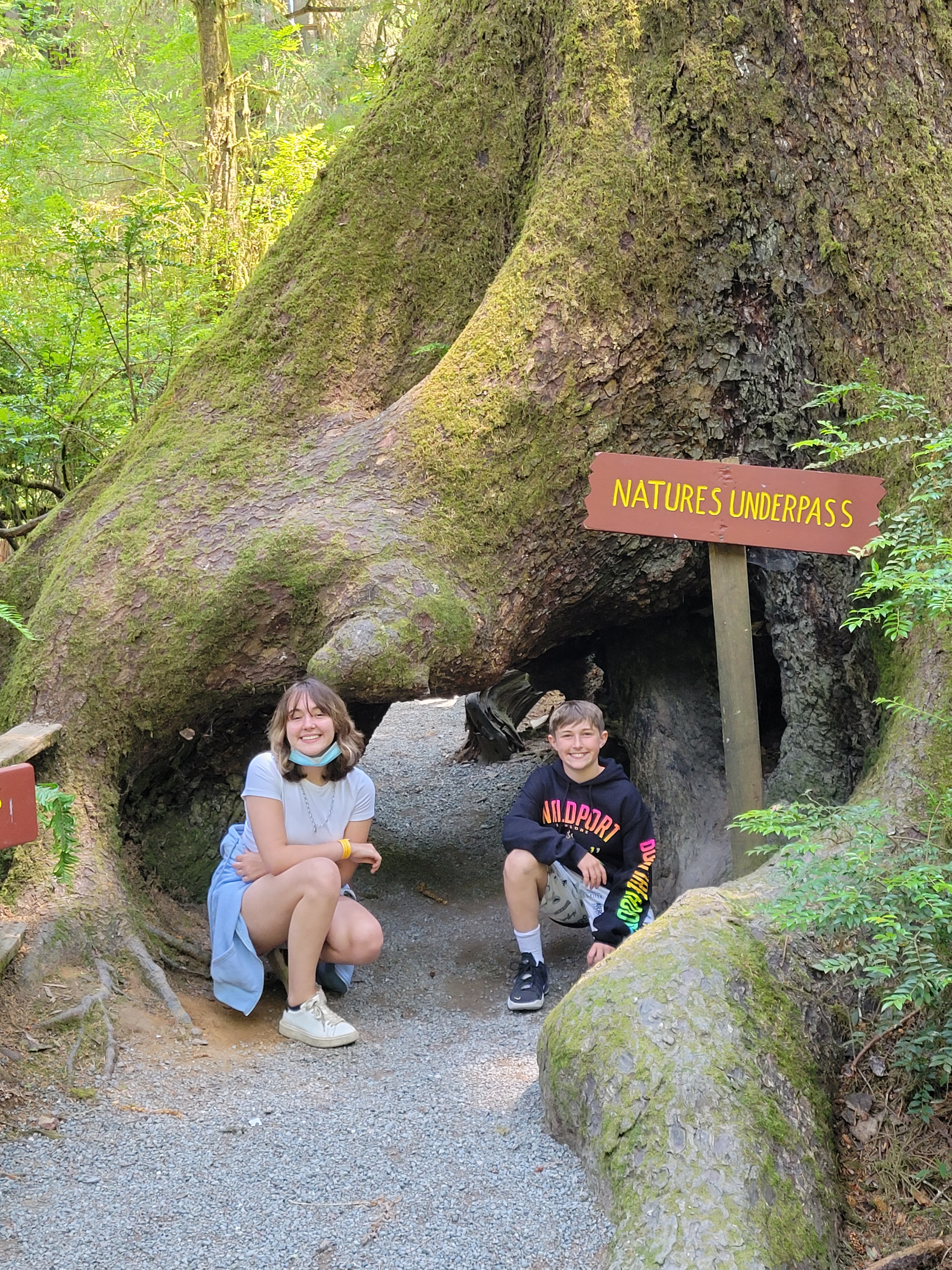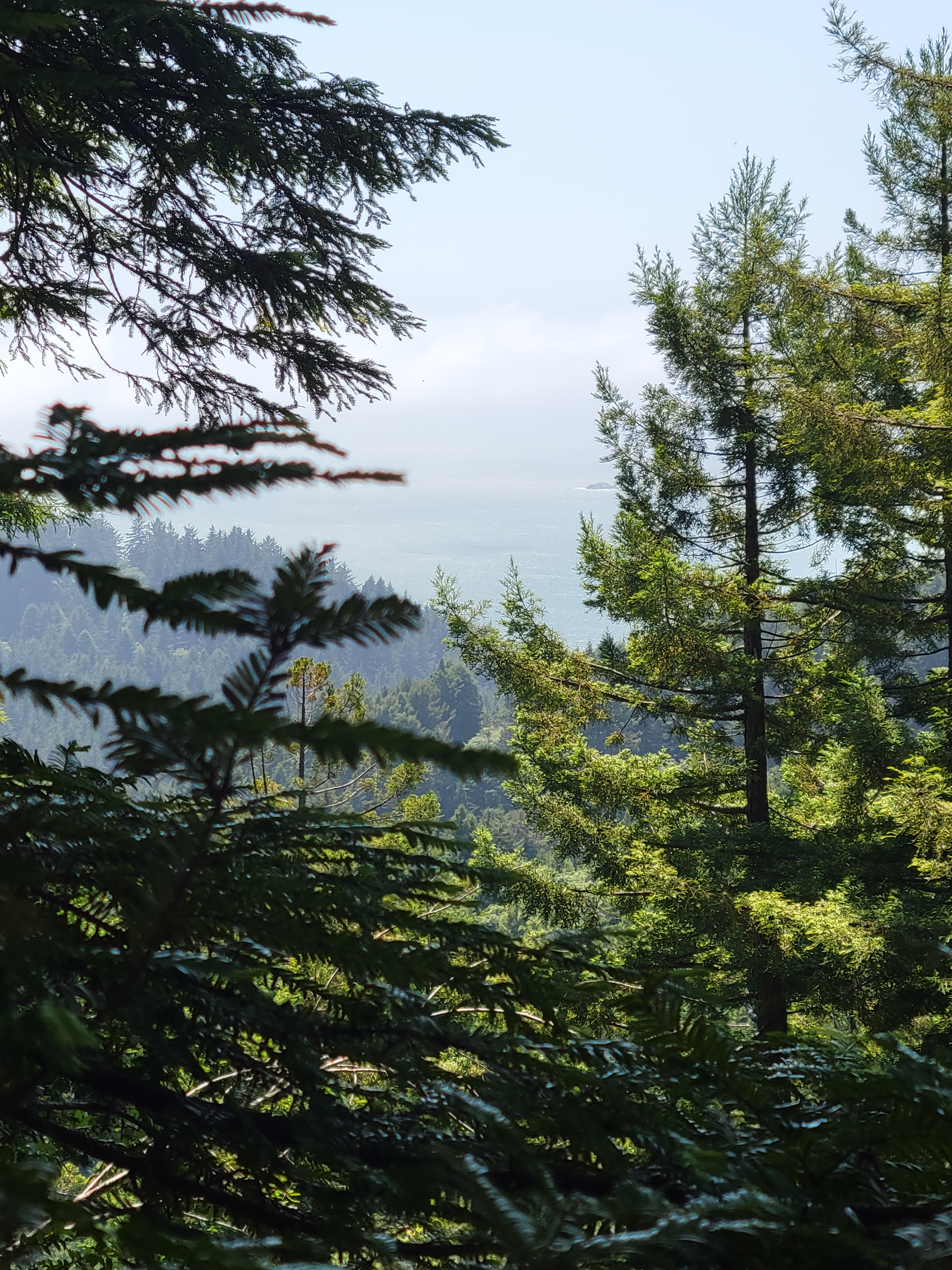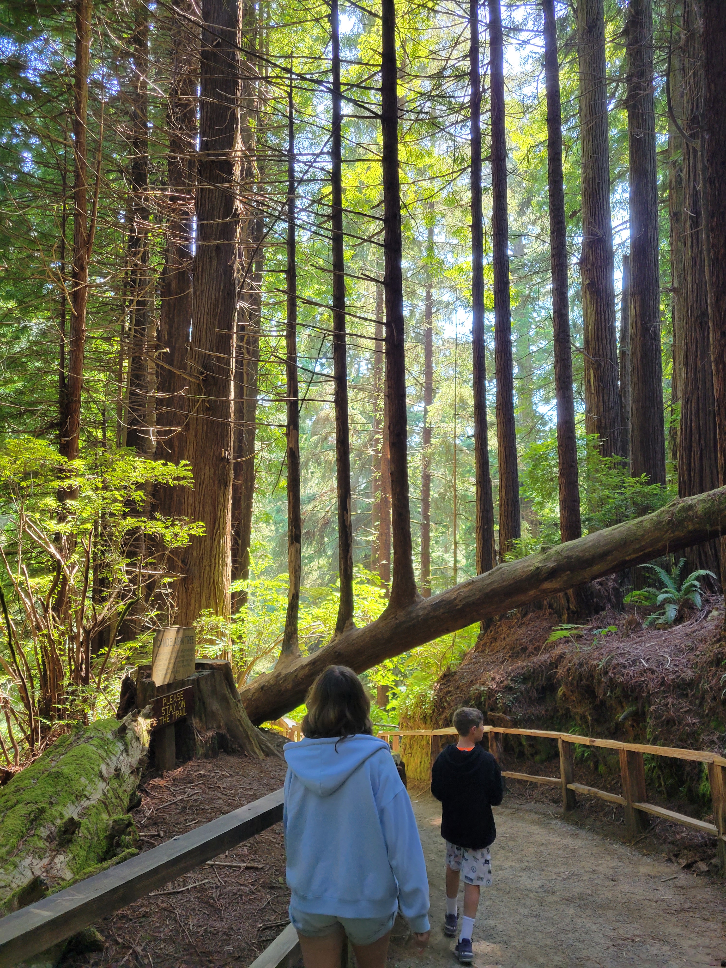 We arrived at Trees of Mystery to find a massive Paul Bunyan statue, complete with his pet ox. We got our tickets and walked down the path. Unlike the pared down natural aesthetic of trails in most of the parks we’d already visited, this trail was something along the lines of if Disneyworld carved a path and put up signage and rides along the way. Nonetheless, it was still magnificent to see so many different gargantuan species of trees. The semi-circle of trees that formed “the Cathedral” were interesting and photogenic. After that, there was a suspended path through the canopy, where you can get up close and personal with the tops of the redwoods (and where I suffered through my fear of heights to enjoy the walk with my family.) Everyone (but me) loved it. Afterwards, we stopped for an obligatory photo in front of “The Brotherhood Tree” before taking a gondola to the top of the mountain and look out across the forest towards the ocean.