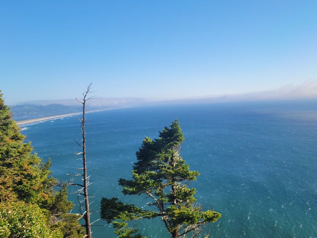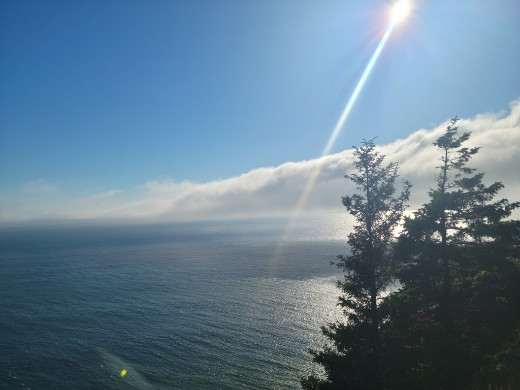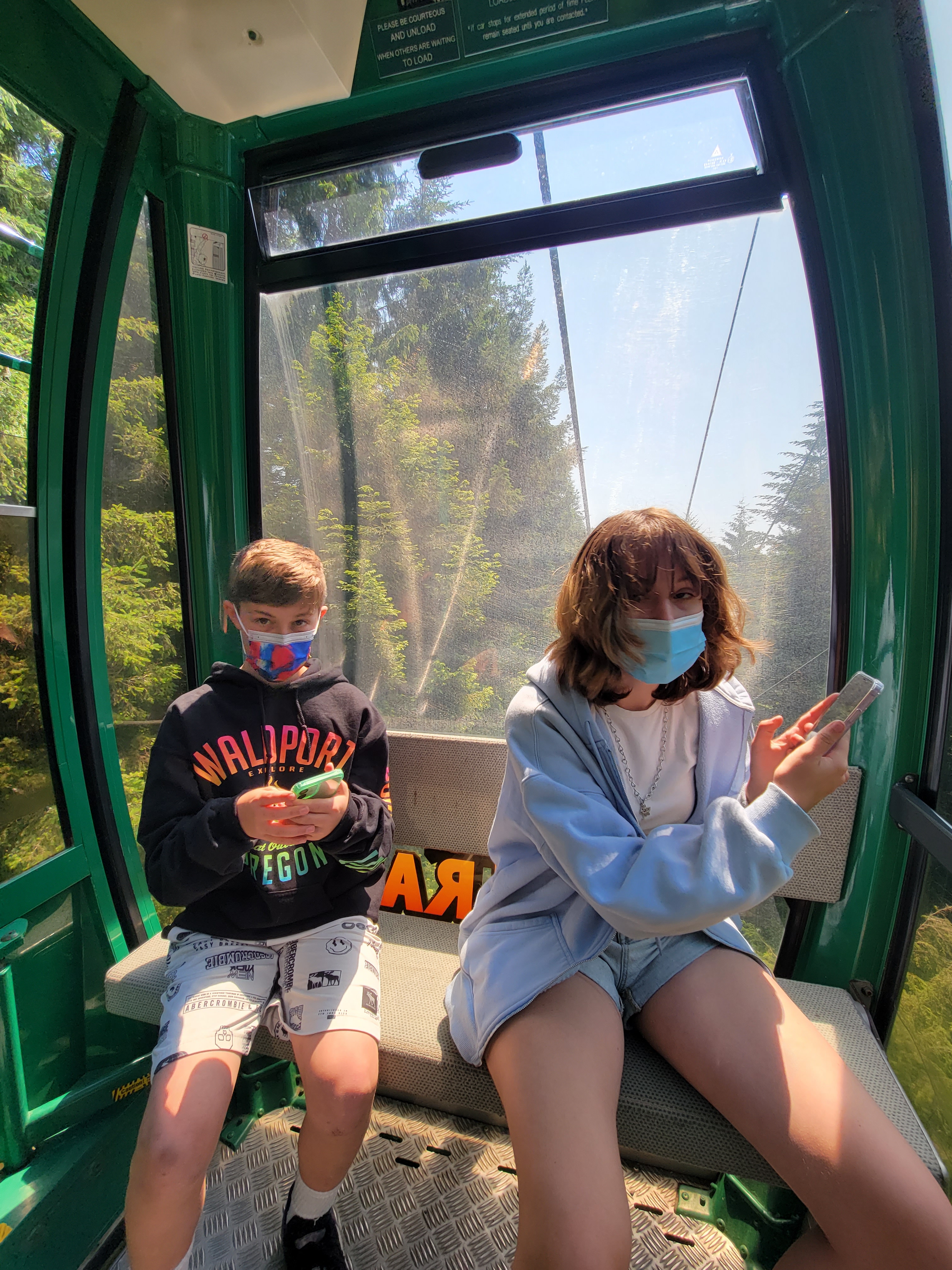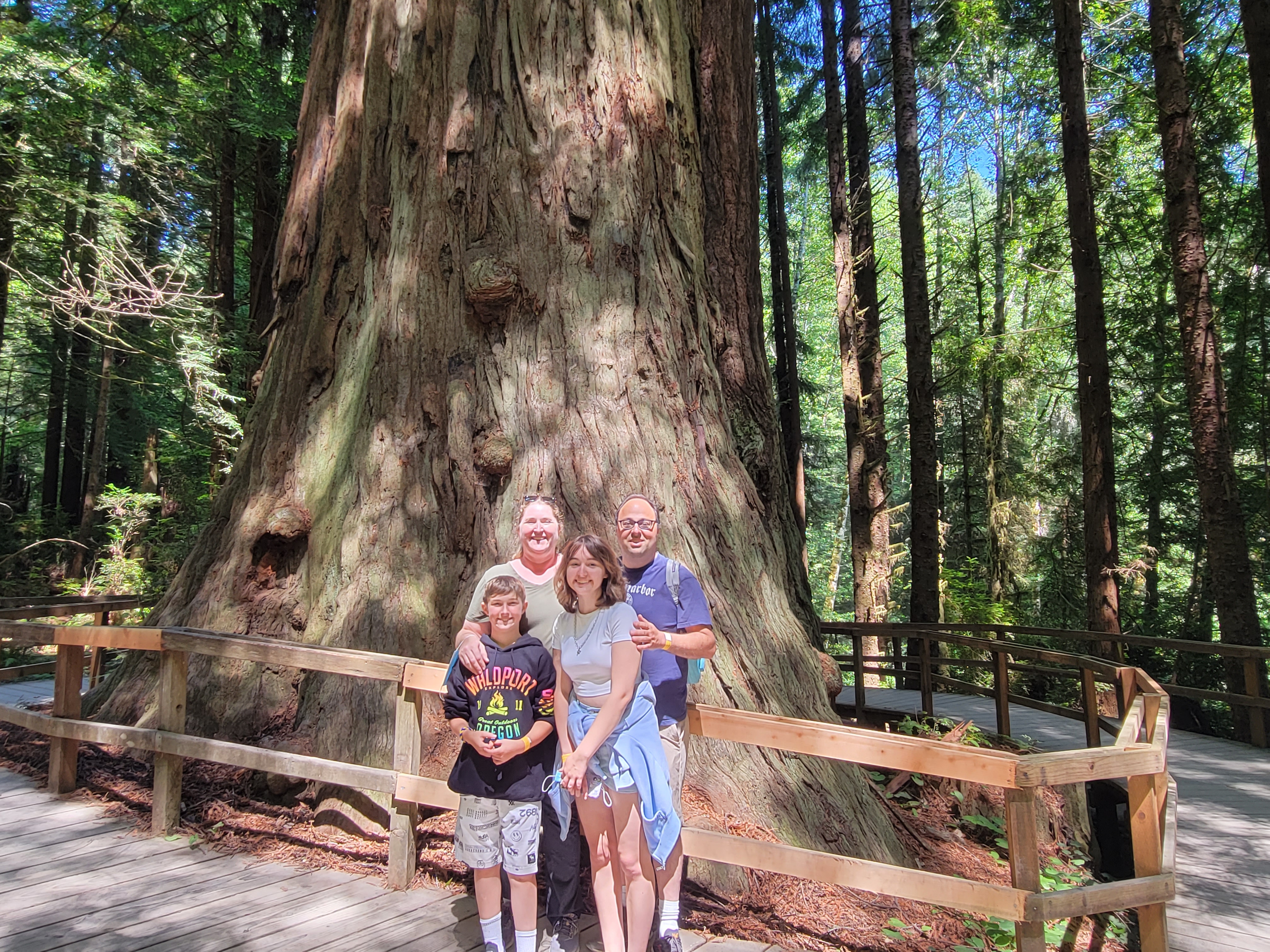 We arrived at Trees of Mystery to find a massive Paul Bunyan statue, complete with his pet ox. We got our tickets and walked down the path. Unlike the pared down natural aesthetic of trails in most of the parks we’d already visited, this trail was something along the lines of if Disneyworld carved a path and put up signage and rides along the way. Nonetheless, it was still magnificent to see so many different gargantuan species of trees. The semi-circle of trees that formed “the Cathedral” were interesting and photogenic. After that, there was a suspended path through the canopy, where you can get up close and personal with the tops of the redwoods (and where I suffered through my fear of heights to enjoy the walk with my family.) Everyone (but me) loved it. Afterwards, we stopped for an obligatory photo in front of “The Brotherhood Tree” before taking a gondola to the top of the mountain and look out across the forest towards the ocean.
