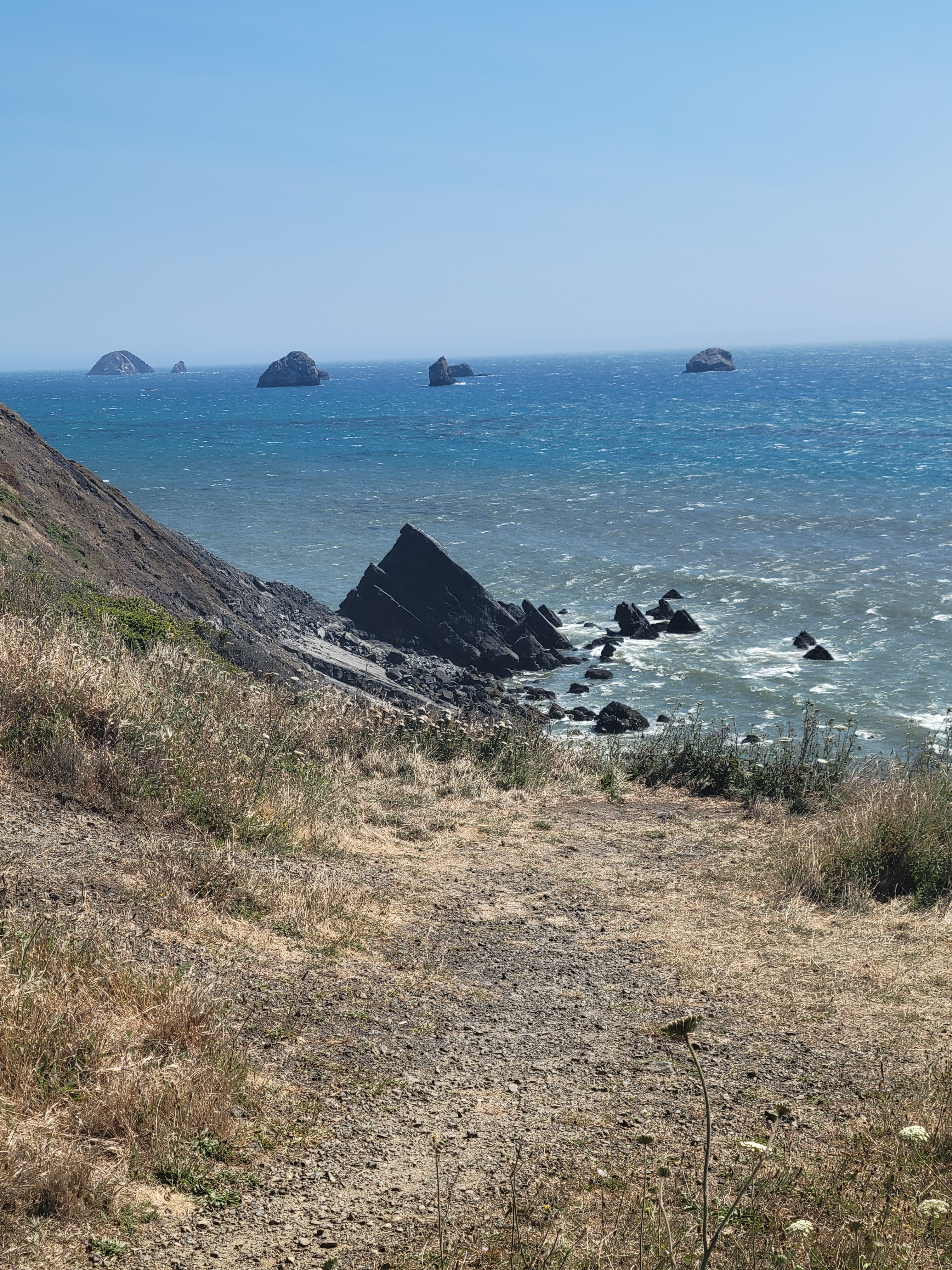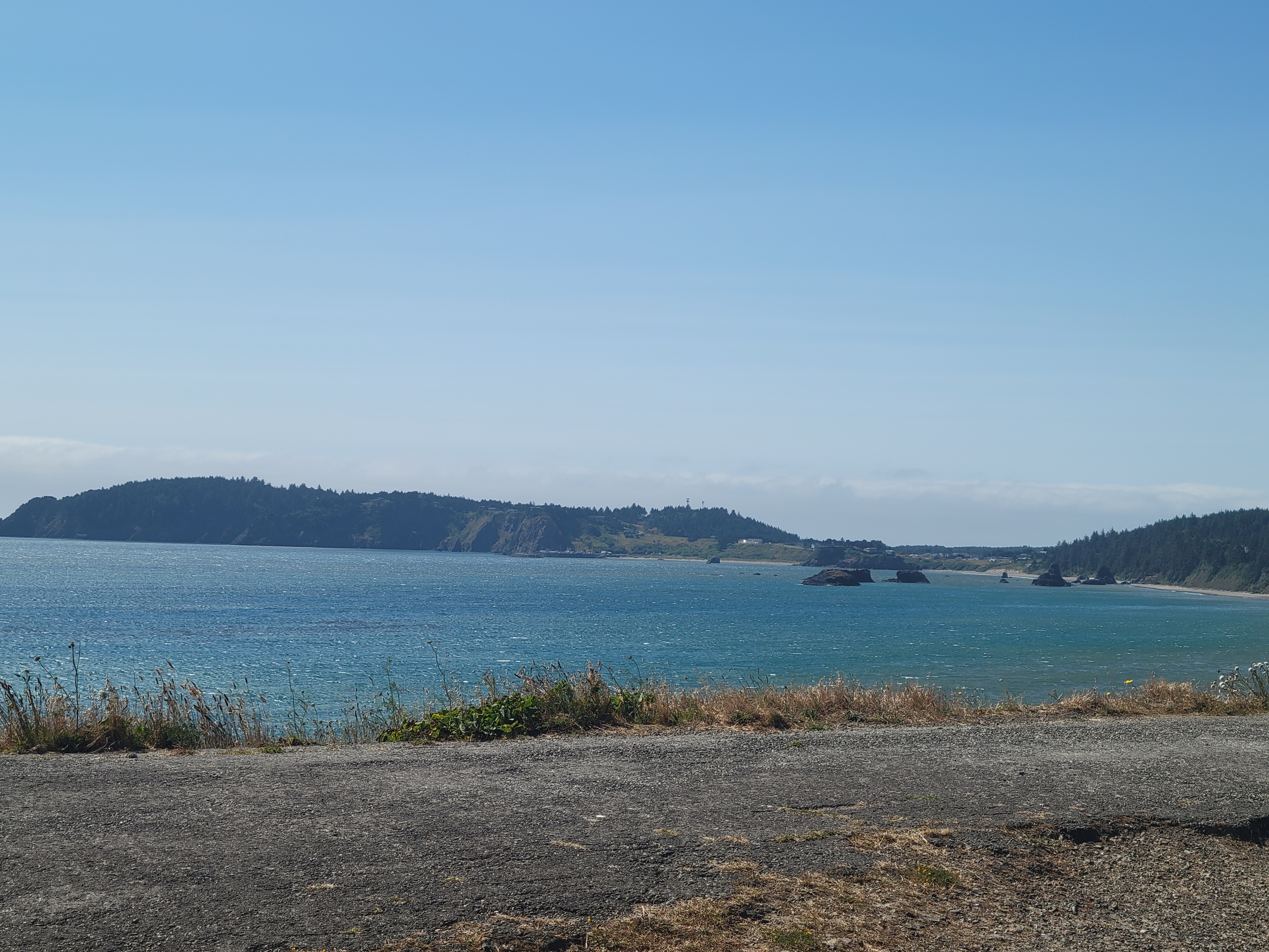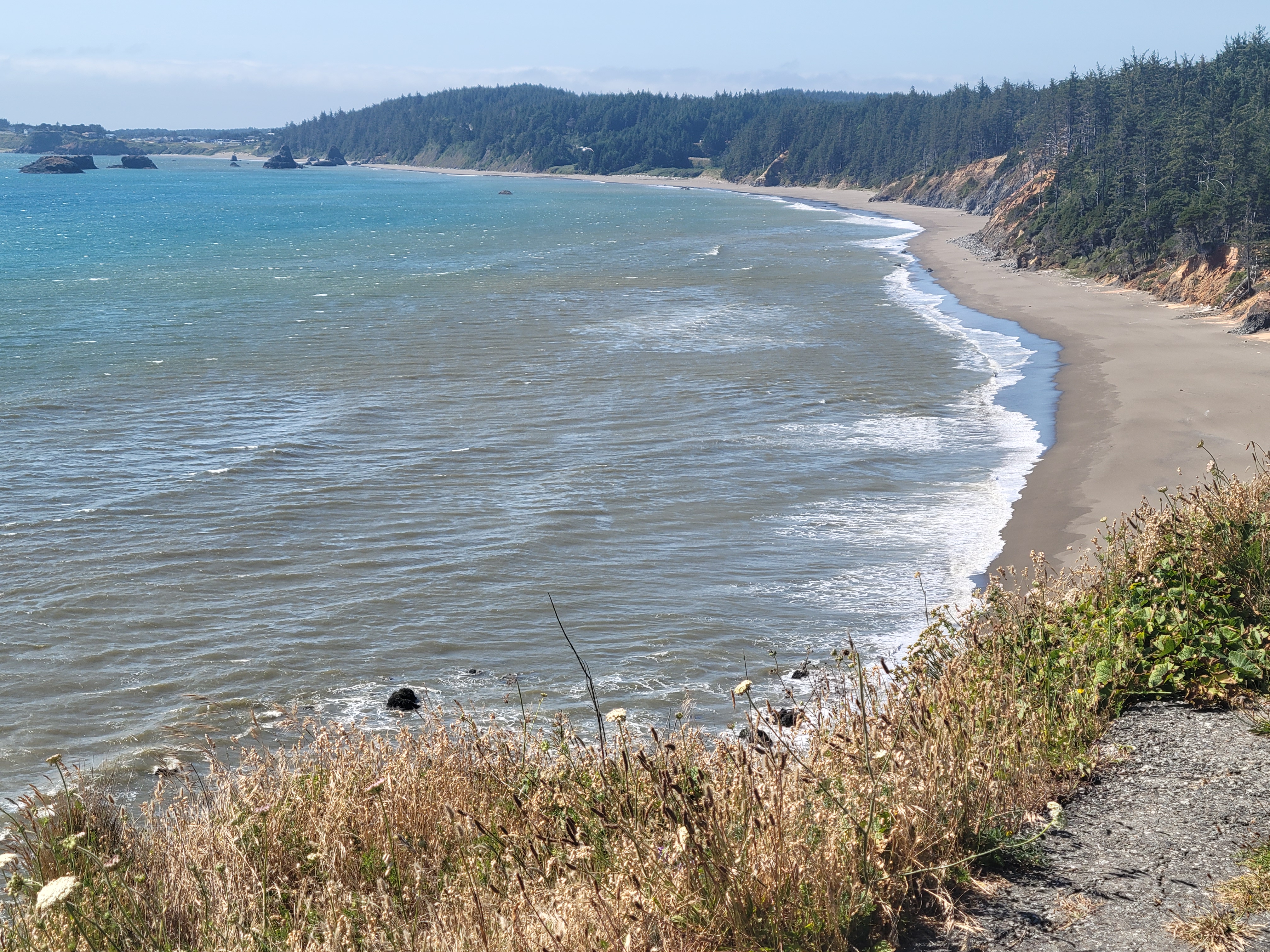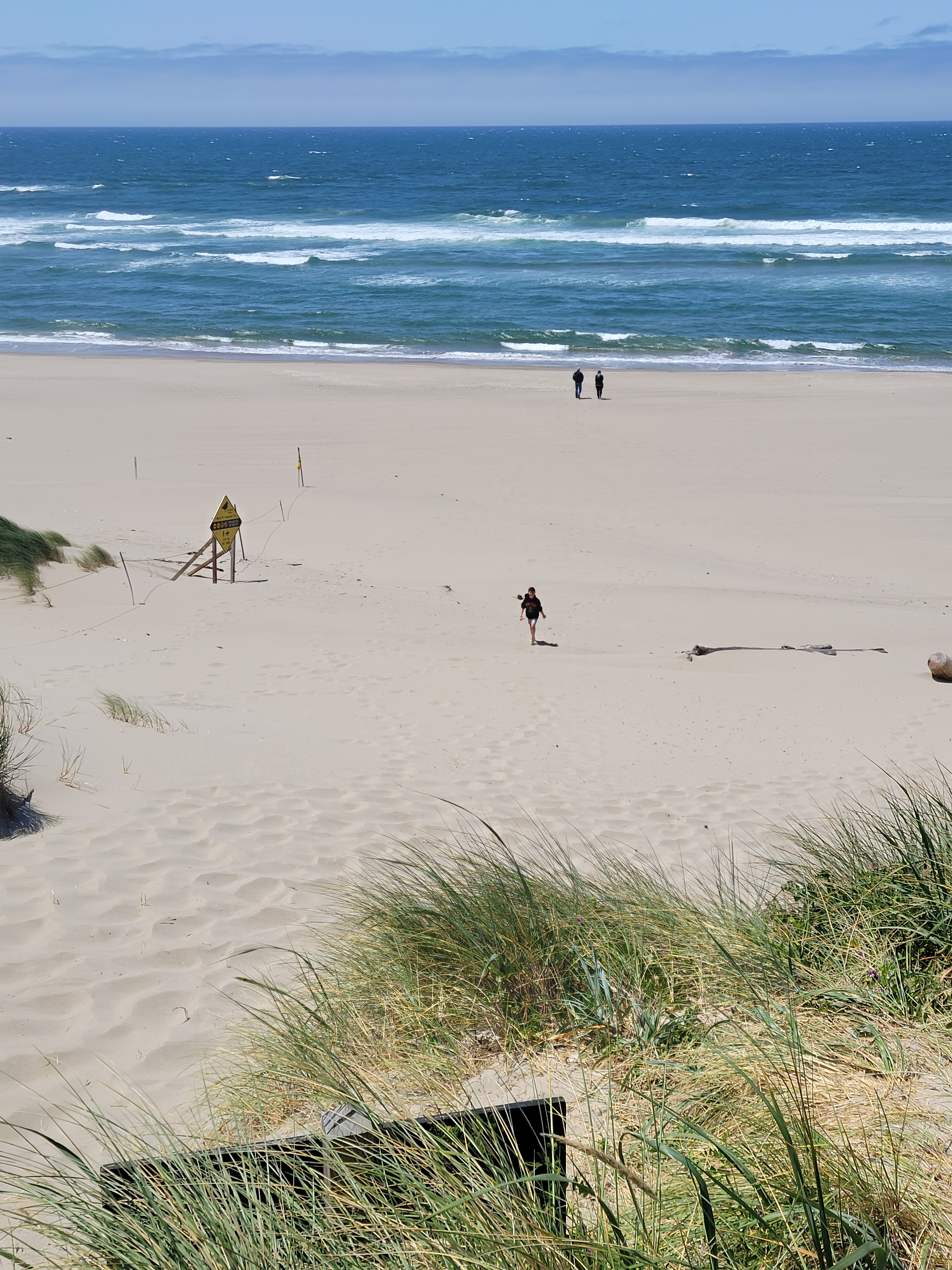Our last day, we didn’t have a long drive, so we took our time driving down the coast. We grabbed coffee in Yachats at a micro-batch coffee roaster, Green Salmon Coffee, which took a good forty-five minutes due to the line. However, we were at our leisure and it was a cute little coffee house, so it was fine by us. As the drive progressed, we left the craggy cliffs of the central and northern coast and shifted into dune topography. ATV and ORV rental businesses abounded. I’d like to point out that dunes are one of those things that seem like fun when you’re standing at the bottom of them and they are extremely photogenic. However, after climbing to the top you really have to consider if you want to go down the other side – and necessitate another climb – or just stay there and enjoy the scenery while your kids run down and up like it’s no problem. (Spoiler alert: I chose staying put.) By the end of the drive to California, the dunes disappeared and the scenery turned rocky again.