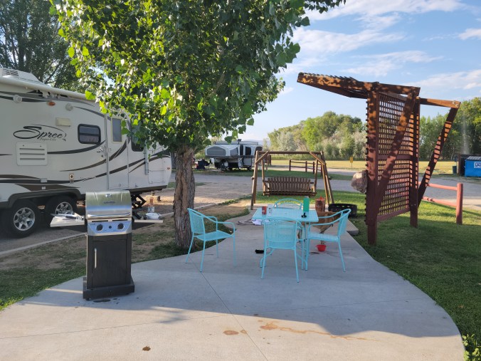 Our campground in Vernal was the Vernal Dinosaurland Holiday KOA. We had a little fenced yard nearby for Cee Cee to walk, a patio and grill. After a little grocery run, we ate barbecue chicken that first night, on the grill, and relaxed. We spent the evening looking at shooting stars with our telescope. The sky just seems so much more vast, and there’s far less light pollution out there.